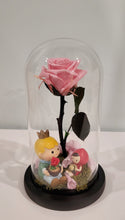 - A stunning rose with pedals in a glass top with doll figures on a wooden base of 12" tall and 6" wide